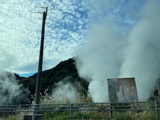 途中の道路沿いには、ところどころで温泉の湯気が上がっていて、火山地帯に来ていることを